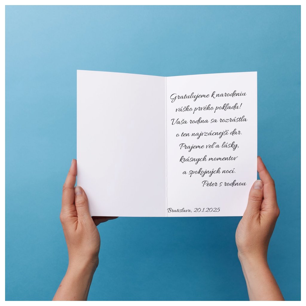 - Každé veľké gesto začína krásnymi slovami. Tento balíček obsahuje gratulačné blahoželanie, ktoré môžete personalizovať svojím vlastným textom. Je to perfektný spôsob, ako vyjadriť svoje pocity, aj keď nemôžete byť pri rodine osobne. Ak neviete, čo napísať, inšpirujte sa našimi prianiami - Čo napísať do blahoželania.