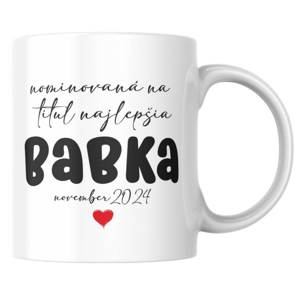 Keramický biely hrnček s nápisom „Nominovaná na titul najlepšia BABKA.“ Perfektný spôsob, ako oznámiť tehotenstvo, s možnosťou personalizácie o mesiac a rok príchodu bábätka.